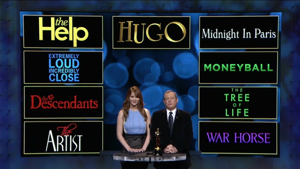 The Tree of Life sadly has no shot—and I honestly can’t believe it got the nomination despite being my #1. Moneyball is a weak candidate in the mold of The Blind Side. War Horse is epic enough and sentimental enough, but has no steam behind it. And Hugo is a children’s film … can those even win this category?