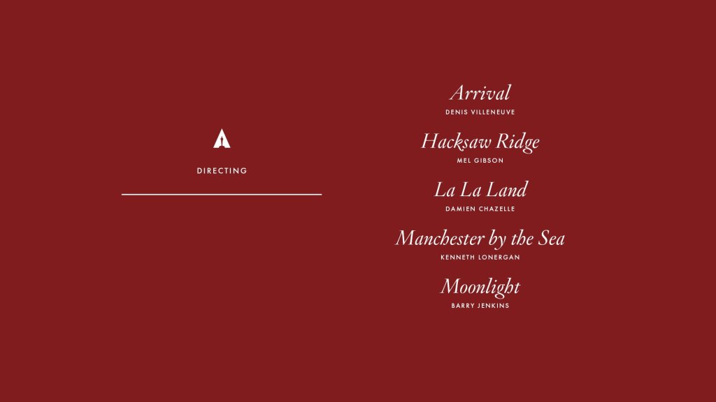 That doesn’t mean better work wasn’t out there to take his place, though. Pablo Larraín for Jackie was thought a shoe-in at one time. Chan-wook Park for The Handmaiden was a long-shot and the opportunity to put a woman in the mix wasn’t far behind with either Andrea Arnold (American Honey) or Anna Rose Holmer (The Fits). This is always one of the harder categories to pare down to five.
