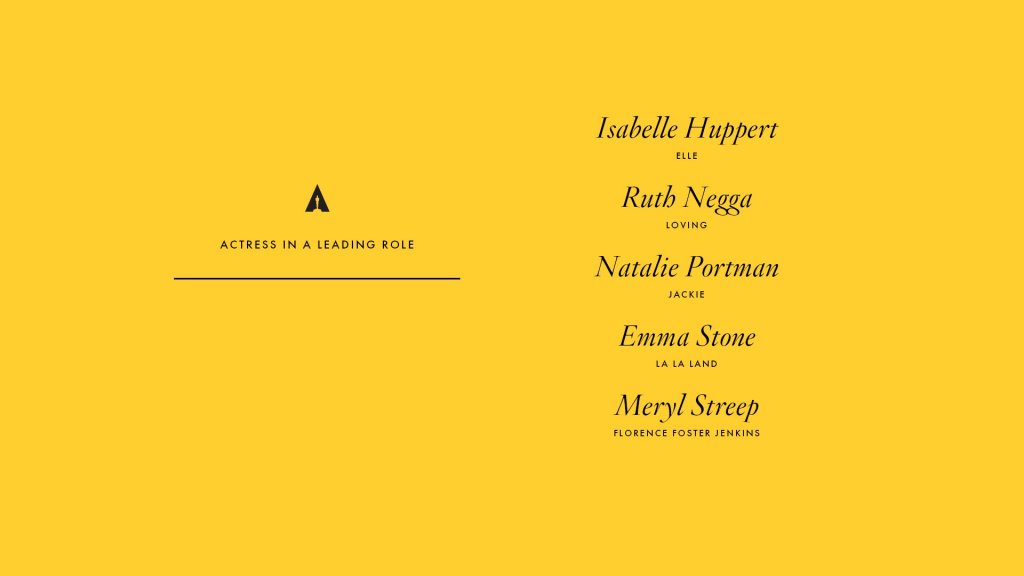 A few months ago, I would have told you Natalie Portman was a lock, but Jackie faded, hard. Ruth Negga is wondrous in Loving, and Isabelle Huppert is fantastic in Elle, but I have to disagree with your pick, Jared—as much as I would love to see Huppert win, I think the nomination is the award for she and Ruth Negga.