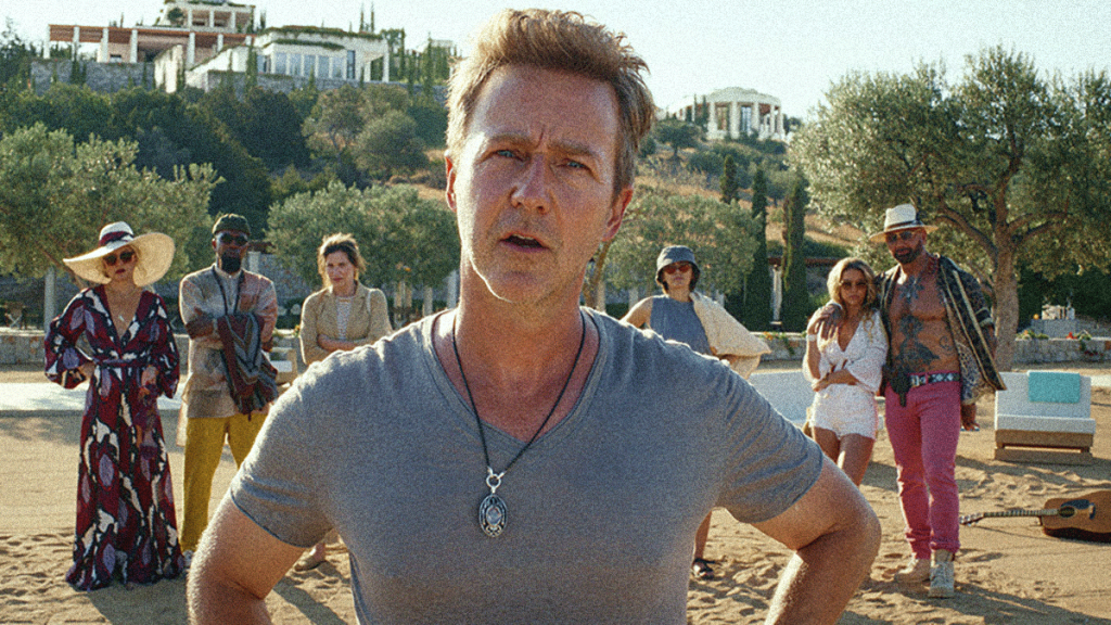 (L-R) Kate Hudson as Birdie, Leslie Odom Jr. as Lionel, Kathryn Hahn as Claire, Edward Norton as Myles, Jessica Henwick as Peg, Madelyn Cline as Whiskey and Dave Bautista as Duke. Cr. Courtesy of Netflix © 2022.