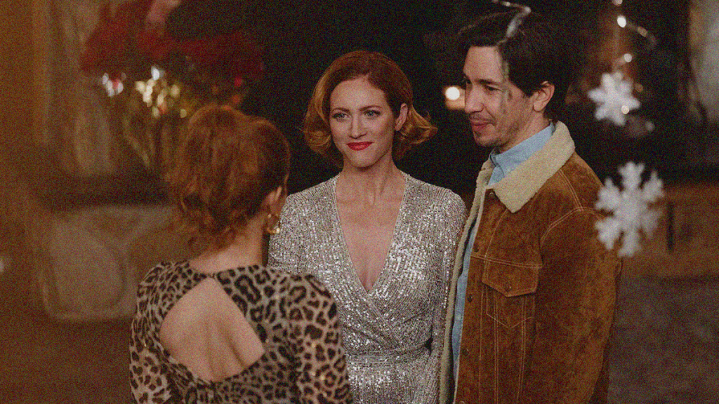 [L-R] Brittney Snow as “Jesse,” and Justin Long as “David” in the romantic comedy, CHRISTMAS WITH THE CAMPBELLS, an AMC+ and RLJE Films release. Photo courtesy of AMC+ and RLJE Films.