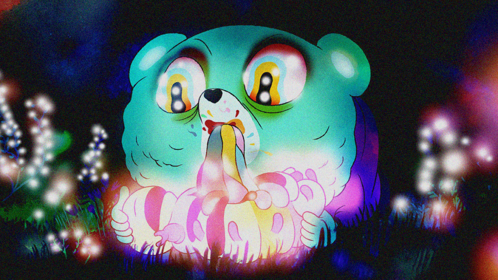 Assisted by hallucinogenic glow worms (that’s not even the craziest scene of the whole) and a literal thirst for blood, Vázquez turns his candy-colored Care Bears into the foot soldiers of a phantasmagoric anti-war hellscape full of urine, intestines, and an eviscerated face only a mother could love (if she were still alive to try). It’s about a Holy War born out of jealousy and bolstered by greed. It’s about the trauma of surviving and the rage of the underappreciated that sustains the carnage.