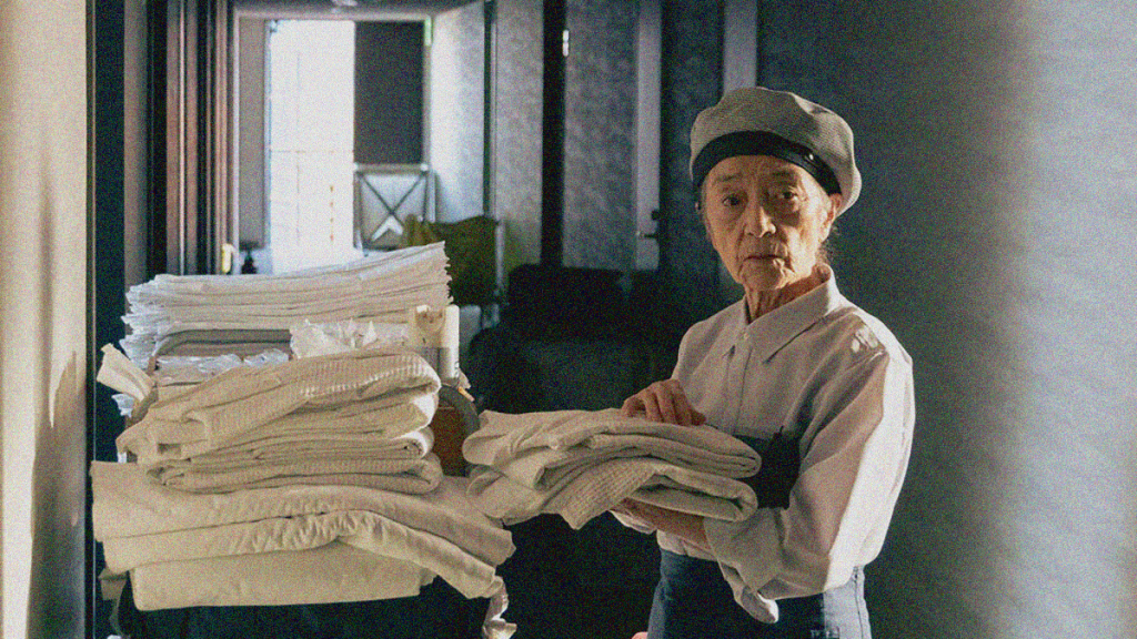 It’s a three-pronged narrative following Chieko Baisho’s Michi, Hayato Isomura’s Hiromu, and Stefanie Arianne’s Maria. Michi is a spry seventy-eight-year-old without family who enjoys working as cleaning staff at a hotel. Hiromu is an up-and-comer at the government Plan 75 program, setting up contracts with potential senior clients and helping on the backend with outreach and budget allocations. Maria is a Filipino immigrant trying to find employment that will pay enough to bring her young daughter over too.
