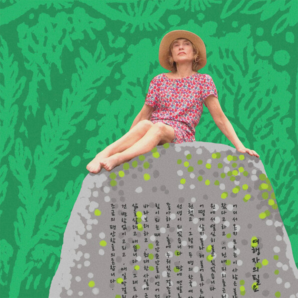 Brian Hung has become a fixture atop these posts the past few years—with good reason. From his early posters for Hong Sangsoo with their meandering lines and repeated motifs to his recent, brilliant use of mixed media via collage and painting, the designer has shifted styles again with A Traveler’s Needs adopting a faux wood-cut appearance via blinding color. What a bold choice to go top-to-bottom green offset with bright pink. It’s as loud as Isabelle Huppert’s wardrobe and just as representative of nature through a graphic printmaking lens. You get lost in the mammoth wall of foliage’s mazes before glimpsing skyscrapers in the distance and deciding to return to the secluded serenity of this outdoor escape. Is its other-worldly sheen a product of the makgeolli we assume fills her thermos? Maybe. Or perhaps its her boulder perch that activates the makgeolli so it can soothe her soul.