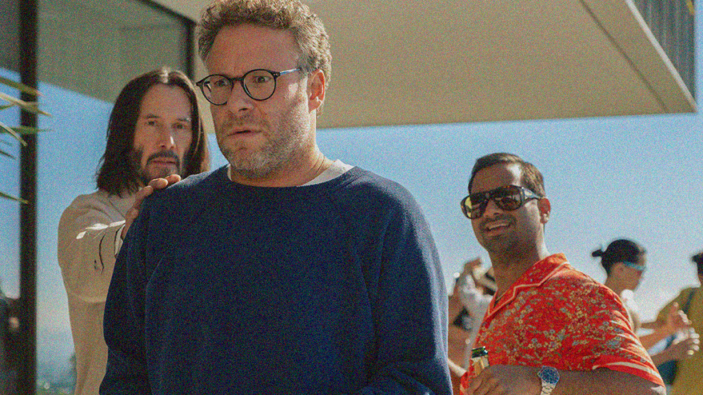 Keanu Reeves, Seth Rogen, and Aziz Ansari in GOOD FORTUNE; courtesy of TIFF.