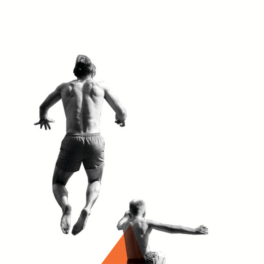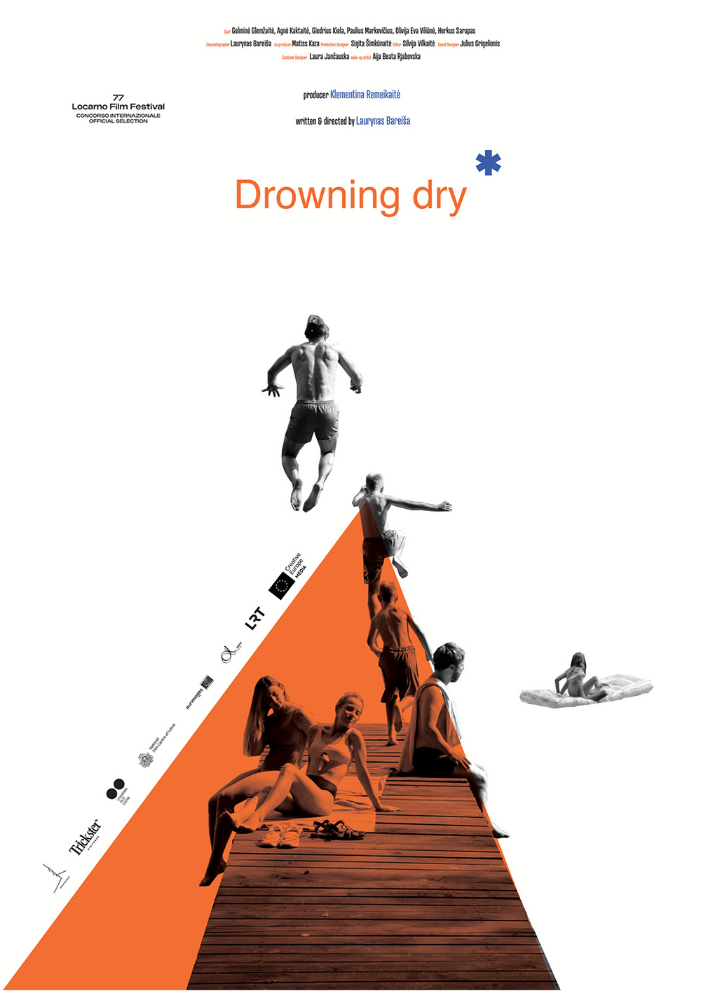 The original Drowning Dry poster’s (Lysa Le adapted it for US release) image economy brilliantly creates motion to compel our vision. We’re obviously drawn to the color since the whole is otherwise stripped down to monochrome black on stark white, so the large orange triangle lures us in before propelling us upward (with the logo procession) as a boy jumps into a nothingness marked by a similarly hued title. The blue asterisk then mirrors the young girl offset from the action with narrative purpose. So too does the triangle’s allusion to time—a clockwise spin to the jump, counterclockwise to the dock.