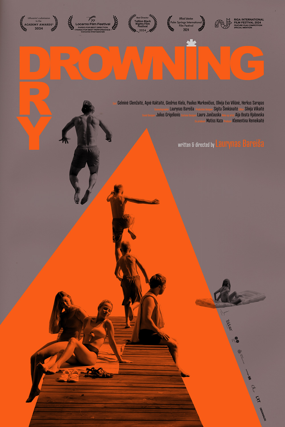 The original Drowning Dry poster’s (Lysa Le adapted it for US release) image economy brilliantly creates motion to compel our vision. We’re obviously drawn to the color since the whole is otherwise stripped down to monochrome black on stark white, so the large orange triangle lures us in before propelling us upward (with the logo procession) as a boy jumps into a nothingness marked by a similarly hued title. The blue asterisk then mirrors the young girl offset from the action with narrative purpose. So too does the triangle’s allusion to time—a clockwise spin to the jump, counterclockwise to the dock.