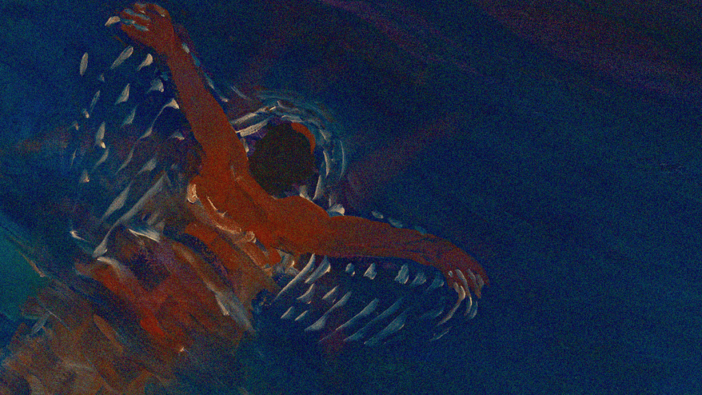 As we learn at the end of seventy-year-old Florence Miailhe’s Butterfly, it was the brother of her subject that taught her how to swim. So, there’s a personal connection to Alfred Nakache on top of his story’s historical merit. One that has led her to create this film using oil, pastels, and sand on glass in ways that allow metaphor and time to pass as though they are projected through water. Birds becoming swimmers. Swimmers becoming dolphins. A boy becoming a man.
